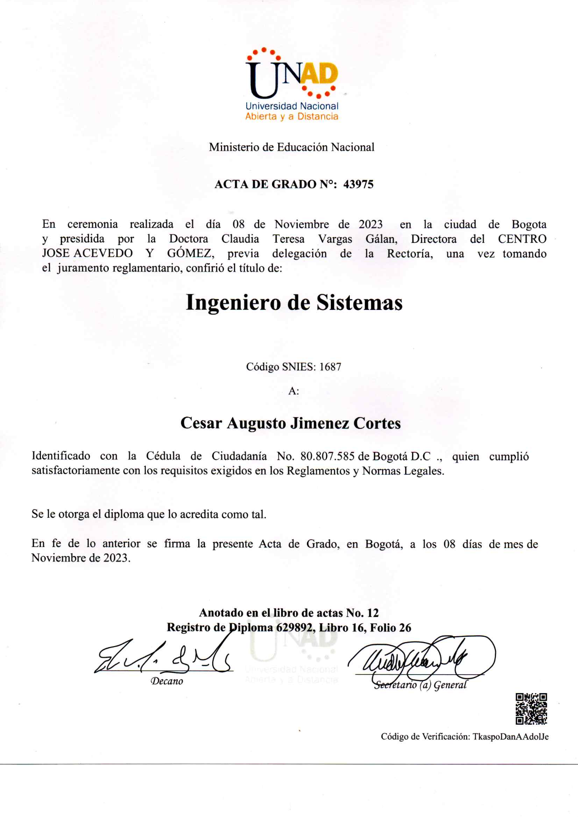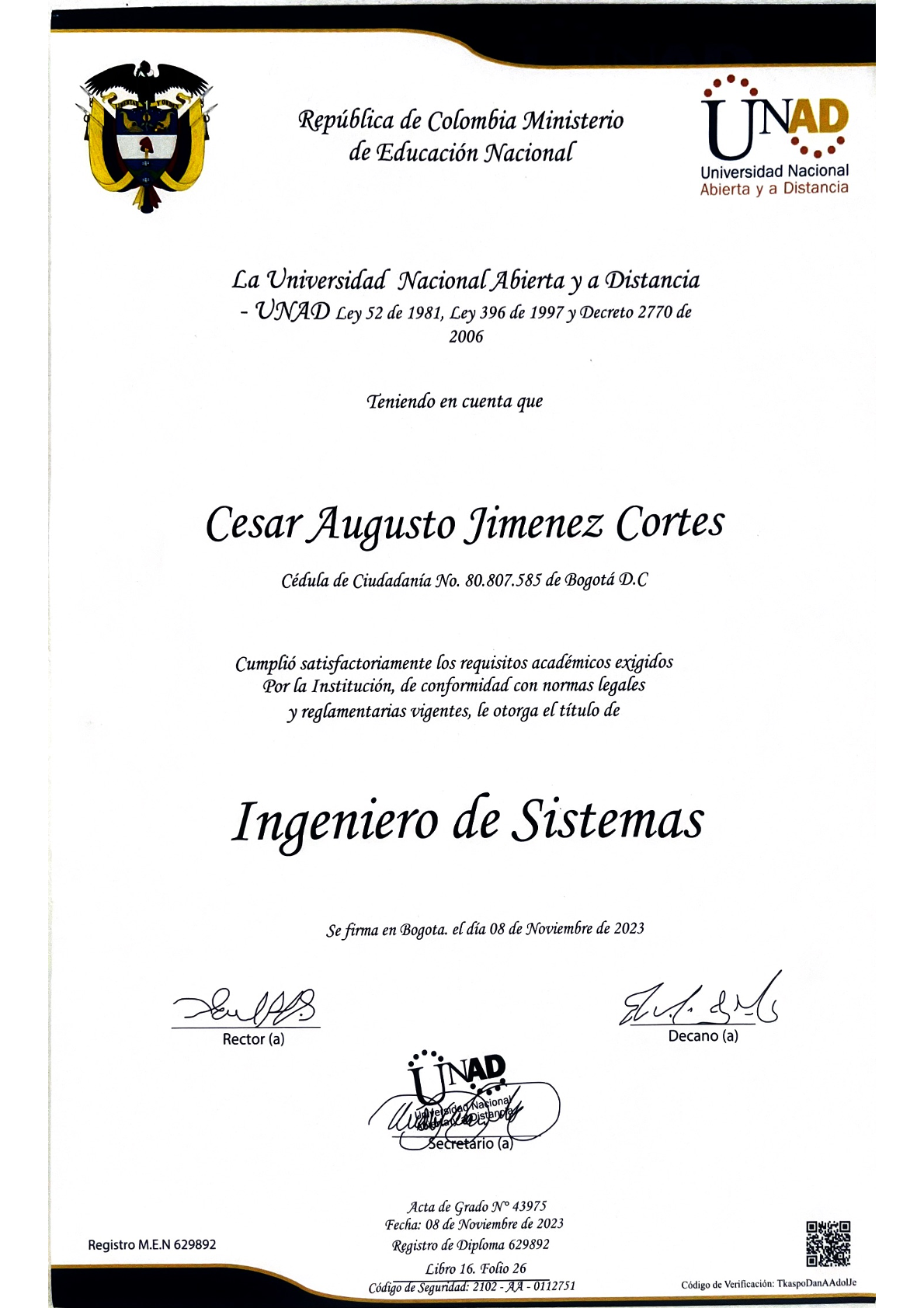CESAR AUGUSTO JIMENEZ CORTES UNIVERSIDAD NACIONAL ABIERTA Y A DISTANCIA CESAR.JIMENEZ@UNAD.EDU.CO SECRETARIO GENERAL CODIGO 0037 GRADO 19 FIRMADO EL 06/11/2023